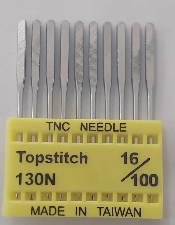 מחטי תפירה Topstitch לשימוש במכונות תפירה, עשויות מפלדה עמידה ומיועדות לתפירה מדויקת ואיכותית, במיוחד בבדים עבים או חוטים עבים. אידיאליות לעבודה עם חומרים כמו ג'ינס, דמוי עור ומוצרי טקסטיל אחרים. מחט טופ סטיץ' בעובי 16/100, תוצרת TNC טיוואן, חזקה ואיכותית, מתאימה גם לעבודה עם חוטים עבים מהרגיל ועבודה בקווילט.
